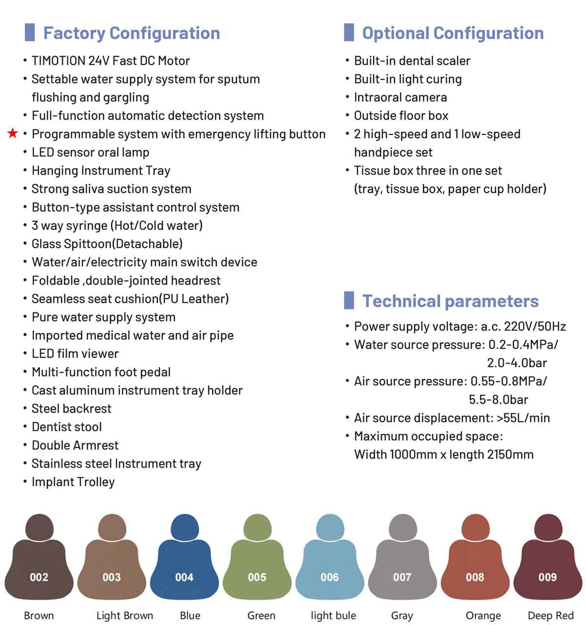 Our dental chairs come with lights as standard. You can also choose to upgrade the dental light according to your preferences.
